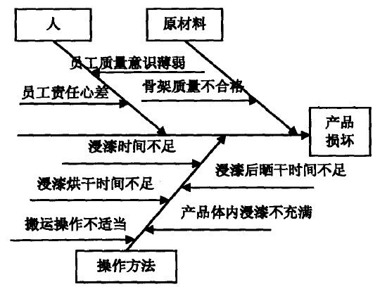 生產過程中的不嚴格操作使得定子內部結構松動,是造成定子震動損壞的直接原因。在對整個生產過程進行仔細分析后,發(fā)現生產流程中繞線的緊密度、磁芯的安裝、產品內部浸漆的充滿程度是造成定子內部結構松動的因素。另外,進一步經過在線抽檢將定子拆解分析,又發(fā)現有些產品在浸漆烘干以后雖然沒有明顯碎裂或損壞,但有已經出現骨架輕微變形或磁芯內部裂紋的現象。這種變形或裂紋也影響了產品各部件間的緊密程度,加上搬運途中的撞擊造成了碎裂。定子損壞原因分析因果如圖1。