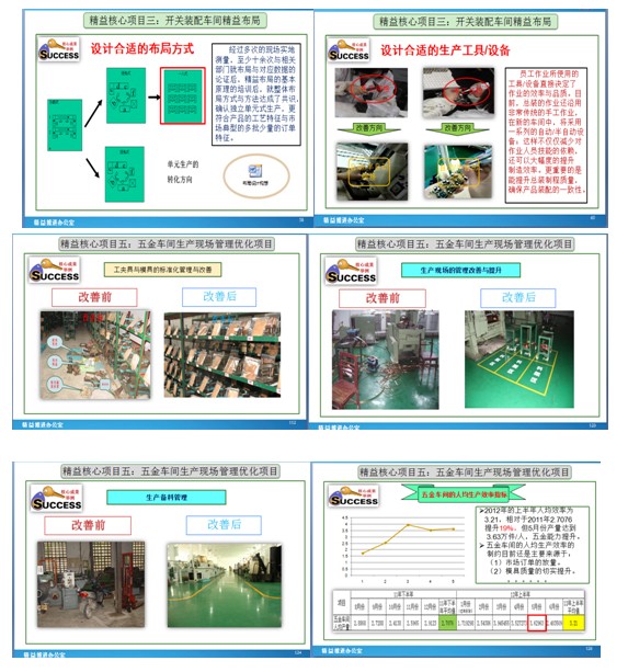在整個(gè)的精益推動(dòng)過(guò)程中,涉及生產(chǎn)計(jì)劃流程優(yōu)化,工廠布局改善,模具管理改善,現(xiàn)場(chǎng)管理改善以及人才培訓(xùn)等方面。